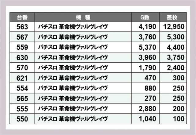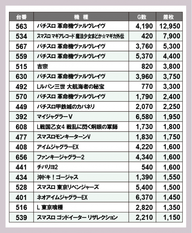 ※差枚数順に掲載しています