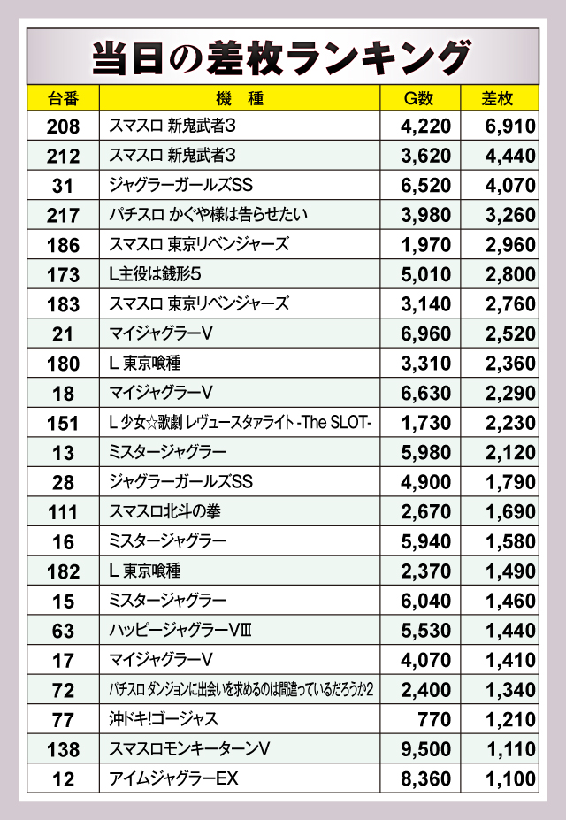 ※差枚数順に掲載しています。