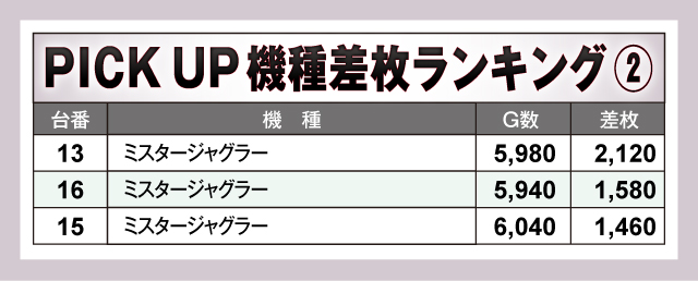 特に注目すべきはピックアップされた機種群の活躍だ。「L主役は銭形5」や「スマスロ 東京リベンジャーズ」は、それぞれが塊で素晴らしい記録を叩き出し、当日の盛り上がりの中核を担った。さらに「ミスタージャグラー」に目を向けると、3台が揃ってプラス差枚を記録し、いずれも+1,000枚を超える好結果。遊技していたファンは、その手応えに満足し、夢中でプレイしていたに違いない。