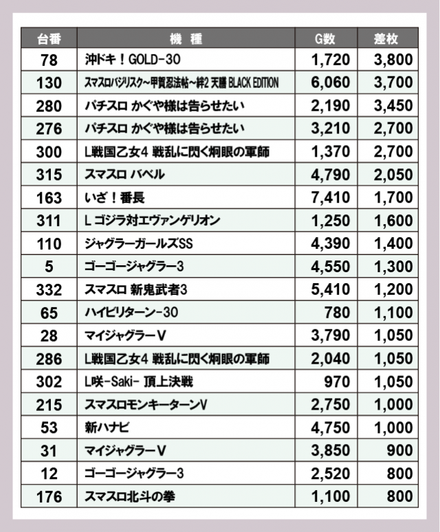 ※差枚数順に掲載しています