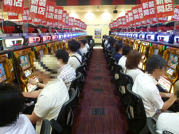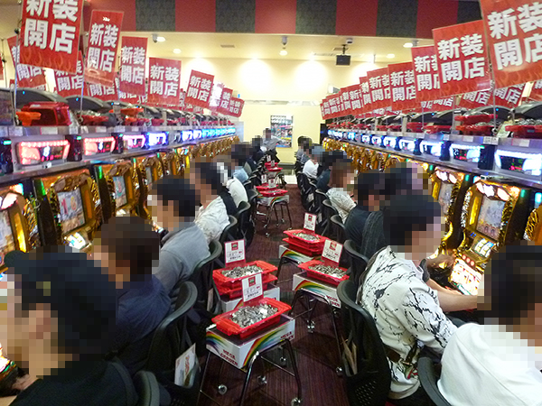 入店直後は大半のプレイヤーがパチスロコーナーへと移動。「押忍!番長3」や「バジリスク~甲賀忍法帖~絆」、GODシリーズなど定番機種の人気が高く、あっという間に席が埋まっていた。