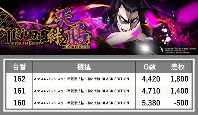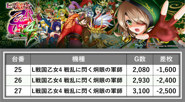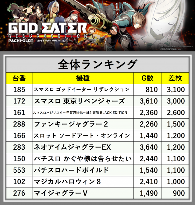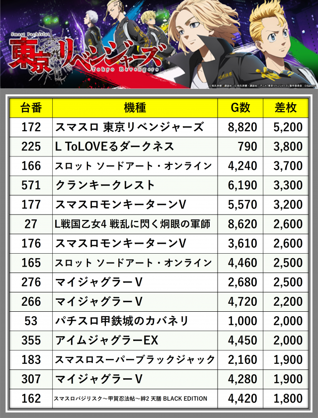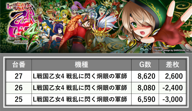 厳選された取材対象機種をはじめ、その他スロット全体から好記録が飛び出した!プレイヤーが楽しんだ1日を下記データにて振り返ってみて欲しい。