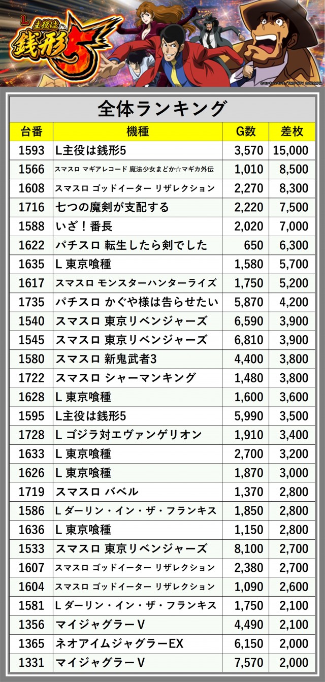 厳選された取材対象機種をはじめ、その他スロット全体から好記録が飛び出した!プレイヤーが楽しんだ1日を下記データにて振り返ってみて欲しい。