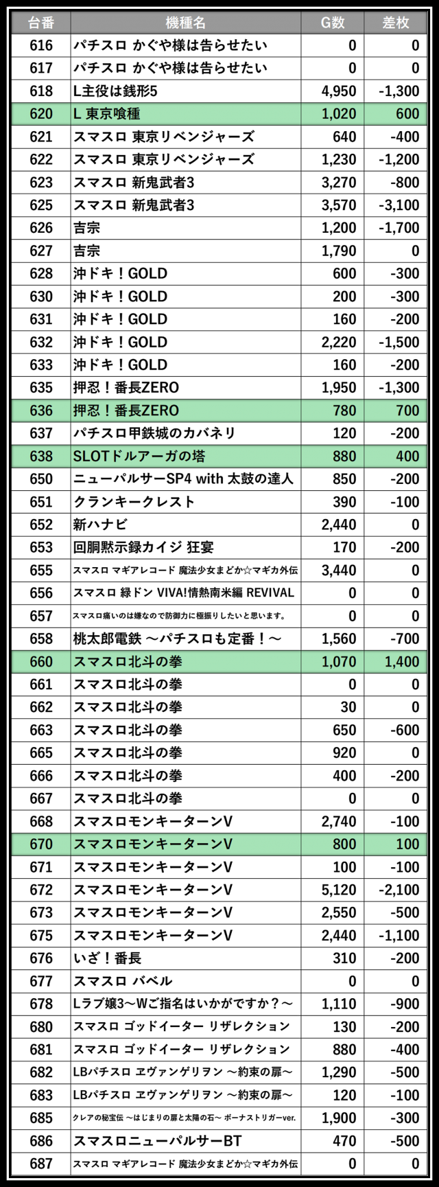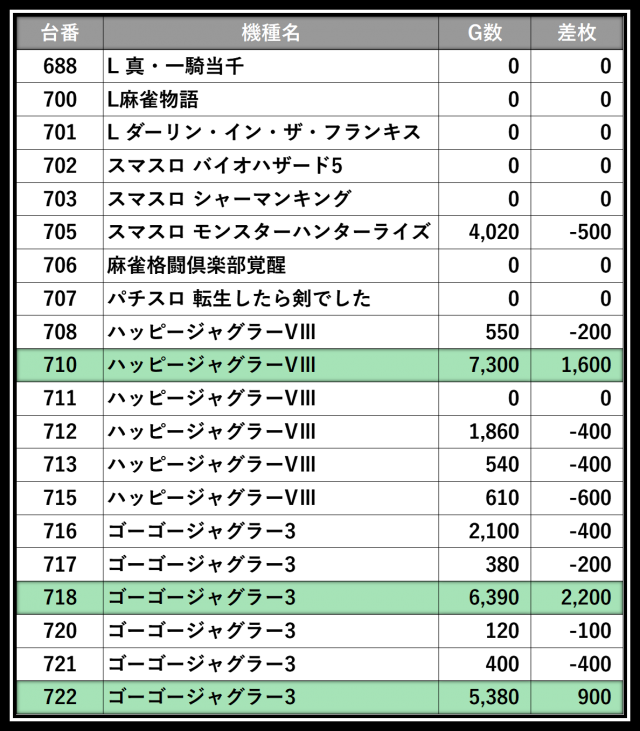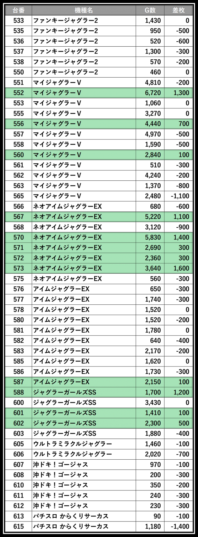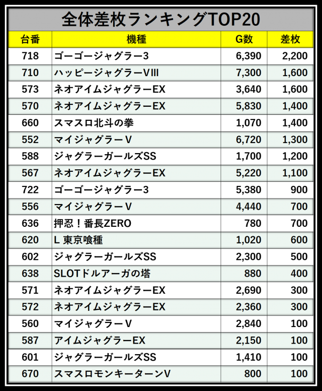 ※差枚数順に掲載しています