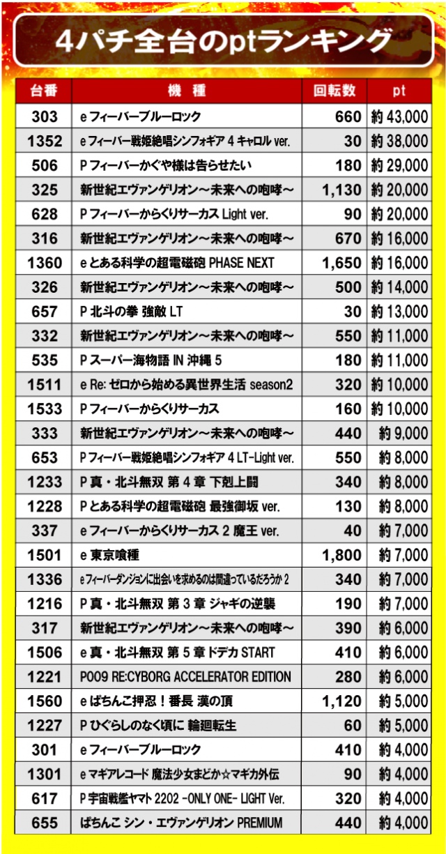今回パチンココーナーでトップに輝いた『eフィーバーブルーロック』は、なんと約43,000ptをマーク!続く『eフィーバー戦姫絶唱シンフォギア4 キャロルver.』は、約38,000ptと素晴らしいパフォーマンスを見せており、店内は興奮に包まれていた。そのほかの台でも順調に大当たりを重ねている様子が見受けられ、ファンたちの盛り上がりがそのまま好結果として表れたようだ!