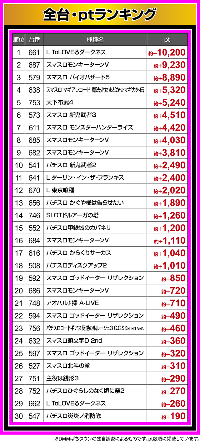 『スマスロ マギアレコード 魔法少女まどか☆マギカ外伝』の638番台や『天下布武4』の753番台なども約+5,200pt以上となった。