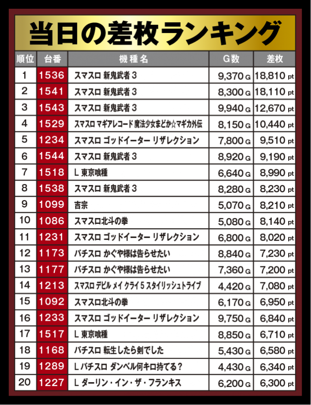 この日のSAPグループはひと味違う。DMMぱちタウンは、「SAP草加店」の特別なひとときを一斉取材した。特に華々しい活躍を残した機種たちをピックアップして紹介しよう。まずは差枚ランキングの発表だ!