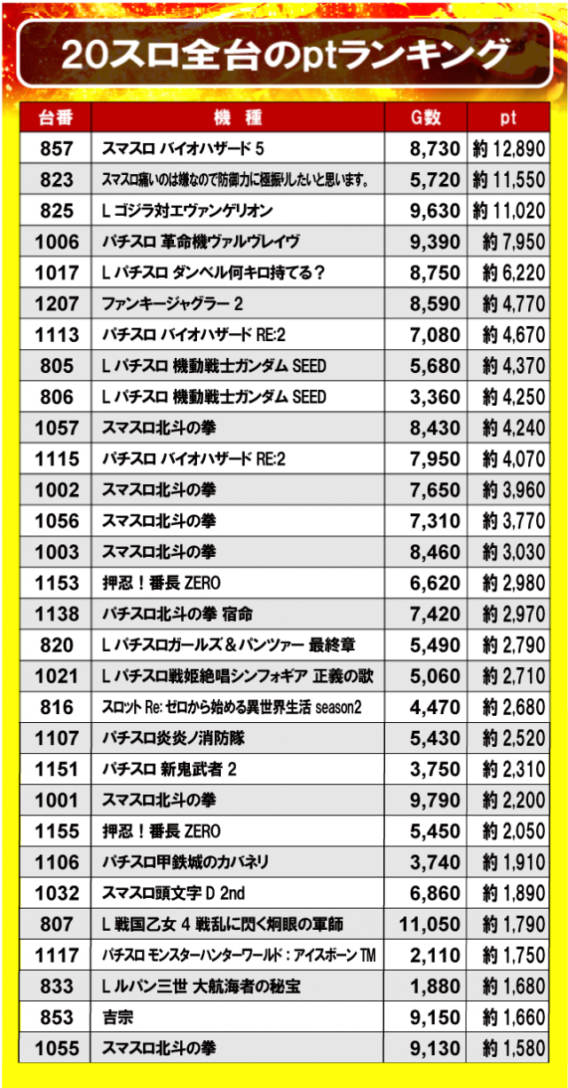 857番台の『スマスロ バイオハザード5』から約12,890pt、823番台の『スマスロ痛いのは嫌なので防御力に極振りしたいと思います。』から約11,550pt、825番台の『L ゴジラ対エヴァンゲリオン』から約11,020ptと万ptOVERが3台発生するという素晴らしい結果に!また、スマスロの活躍が目立つ中、メダル機の存在も依然として健在であることを実感させるランキングとなっていた!
