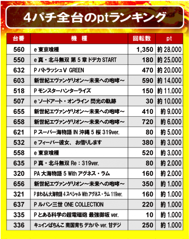 パチンココーナーでは、『e 東京喰種』『e真・北斗無双 第5章 ドデカSTART』『PパトラッシュⅤ GREEN』が約20,000ptOVERをマークし、これら機種が盛り上がりをリードする存在となっていた!