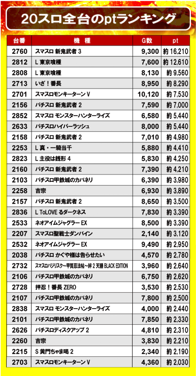 ①20スロ全台のptランキング