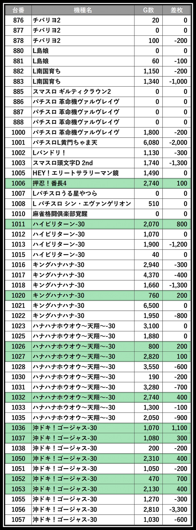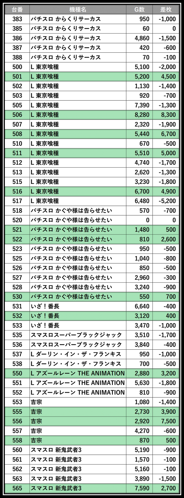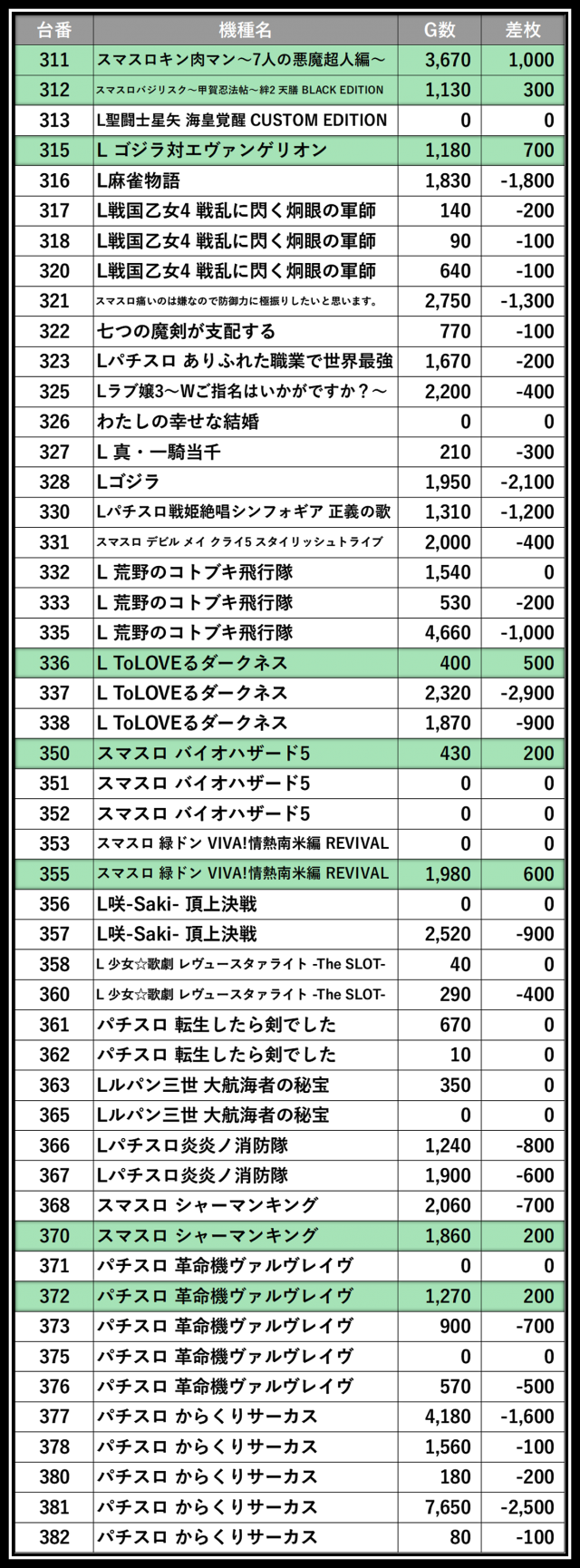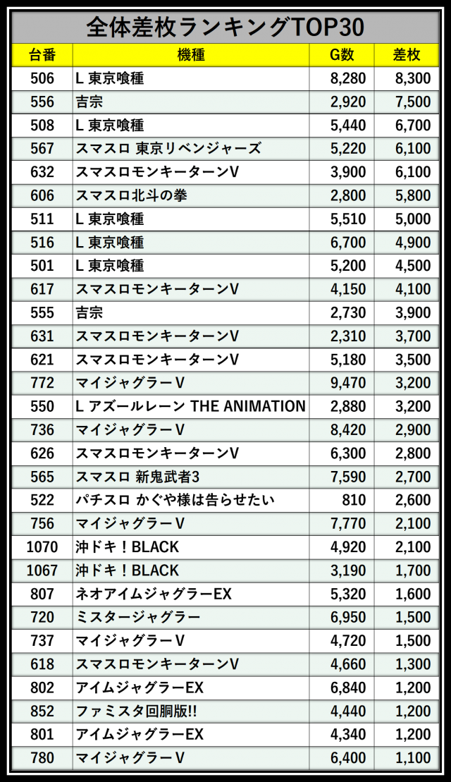 ※差枚数順に掲載しています