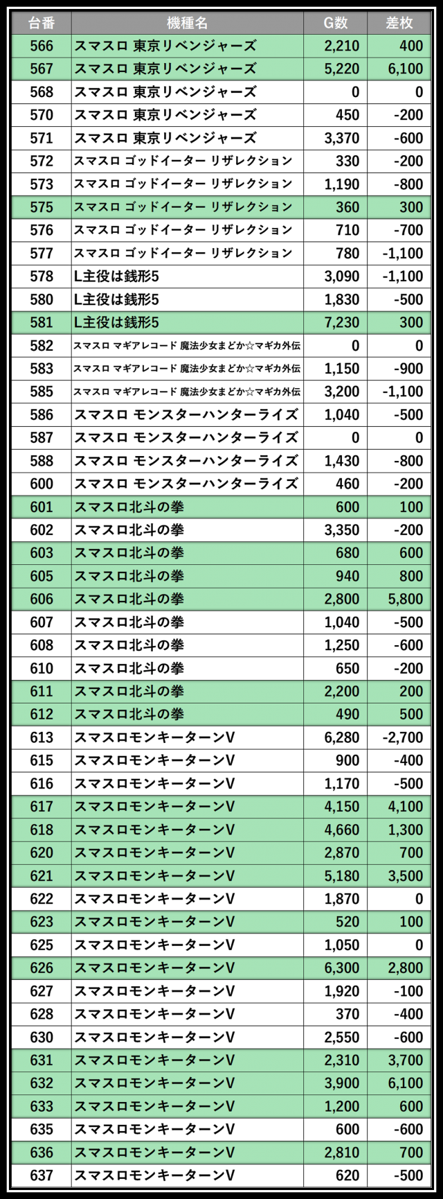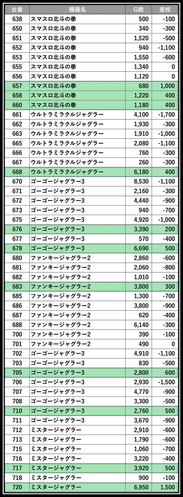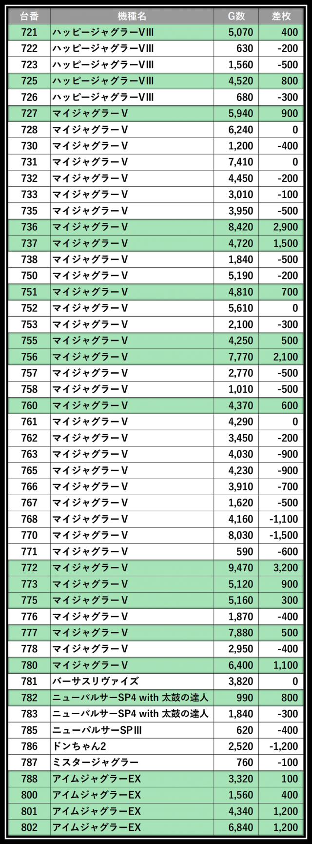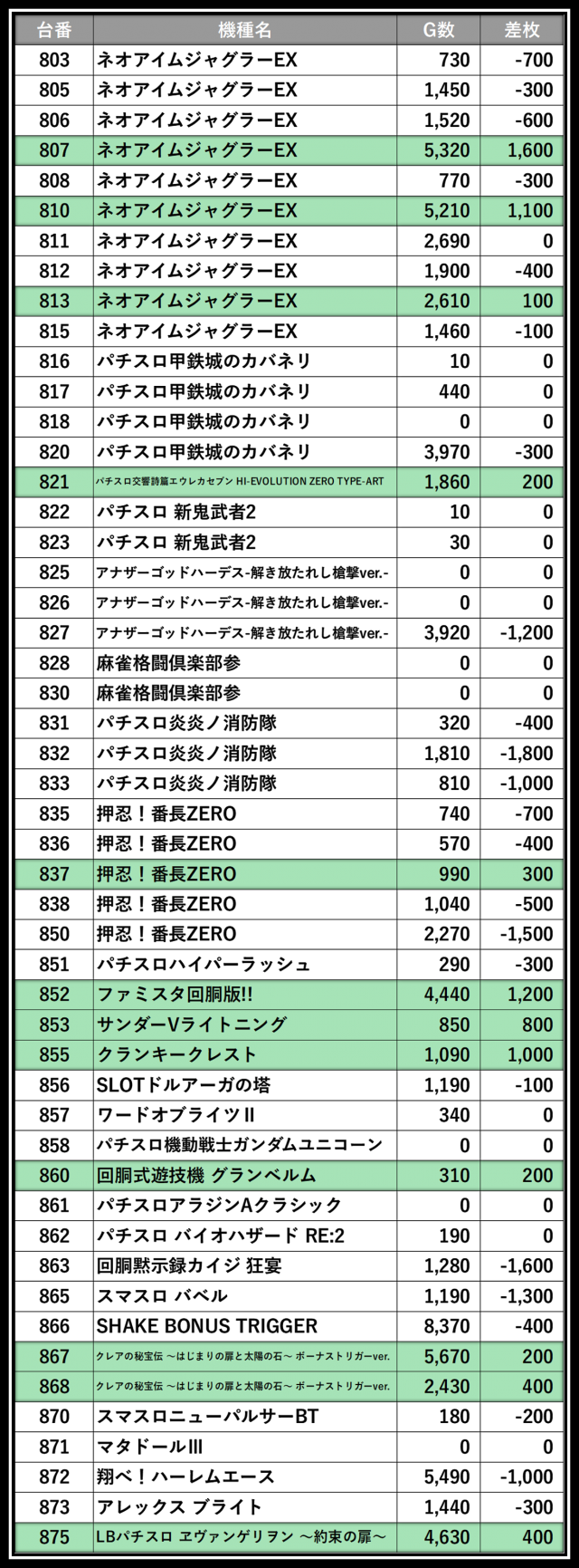 ※差枚数順に掲載しています