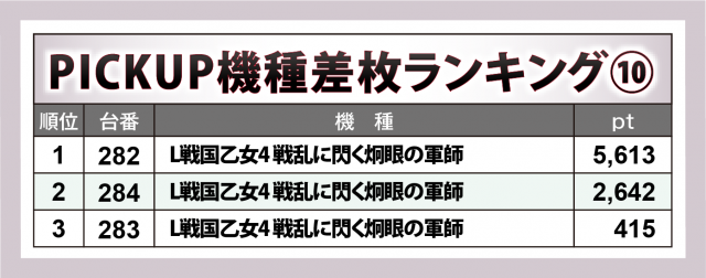上で紹介した以外では『マイジャグラーⅤ』『ファンキージャグラー2』『L戦国乙女4 戦乱に閃く炯眼の軍師』『ネオアイムジャグラーEX』『スマスロ北斗の拳』と、台数の多い機種に好調が窺えた。