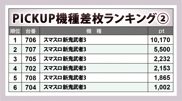 『スマスロ 新鬼武者3』8台もプラス台の割合は高く、その6台全てが4桁以上のpt数をマーク。706番台が万枚を奪取した他、+5千5百超が2台・+2千2百付近が2台とクオリティは高かった。