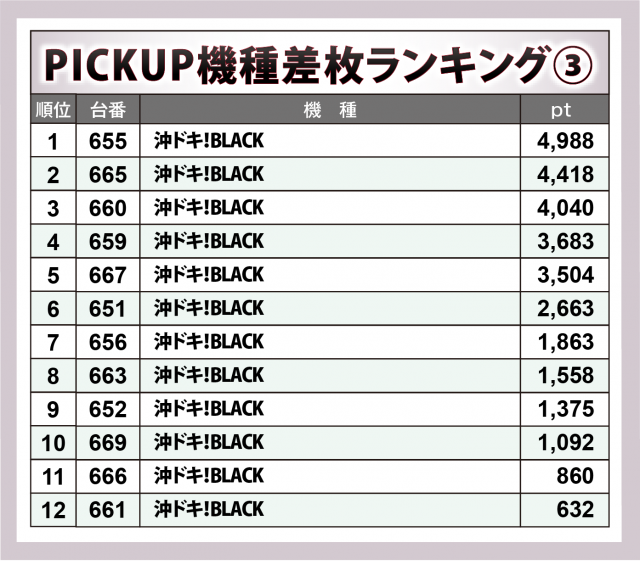 『沖ドキ!BLACK』20台はプラス率5割超えを収めた。+5千弱を筆頭に+4千超・+3千5百超が2台ずつ&+2千7百弱が1台&+1千超が4台と、スマスロに負けず奮闘した。