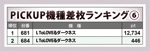 『L ToLOVEるダークネス』4台はちょうど半分の2台がプラス。681番台が+1万2千7百超のビッグヒットを叩き出した。