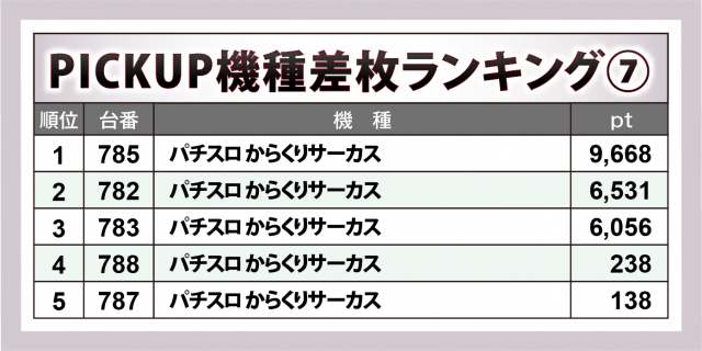 『パチスロ からくりサーカス』10台もピッタリ半分の5台が勝利。785番台が万枚直前となった他にも+6千超が2台と、高い内容を誇った。