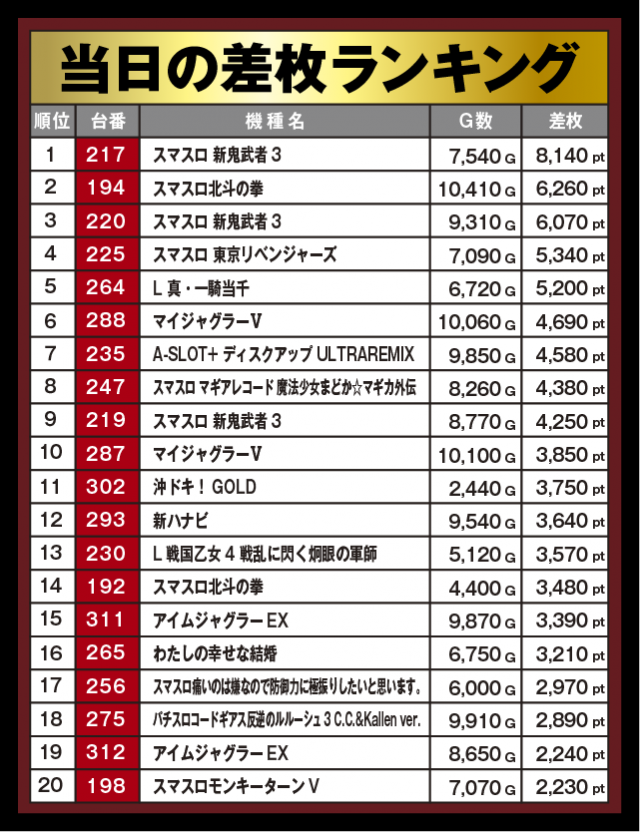 この日のSAPグループはひと味違う。DMMぱちタウンは、「SAP流山」の特別なひとときを一斉取材した。特に華々しい活躍を残した機種たちをピックアップして紹介しよう。まずは差枚ランキングの発表だ!