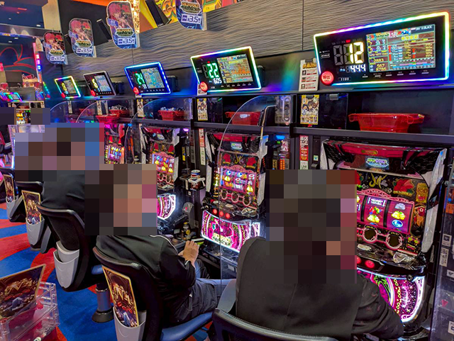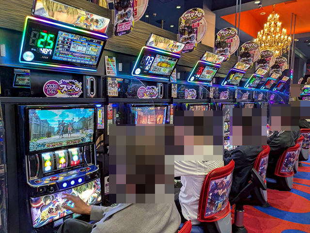 「スマスロ 新鬼武者3」に空き台はみあたらず、うれしそうに遊技をおこなっている姿が多い。