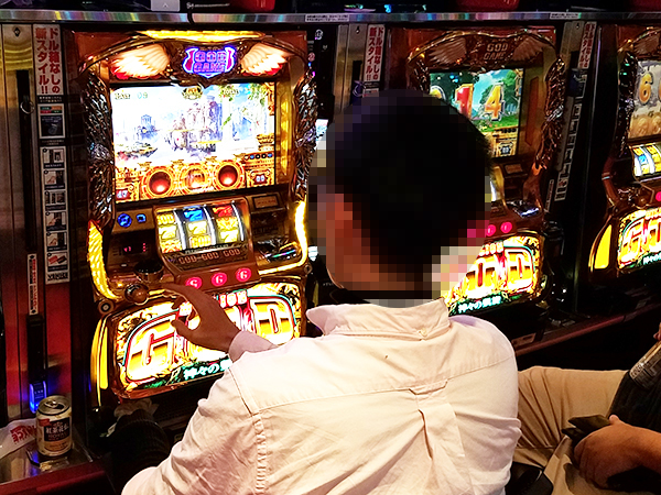 「ミリオンゴッド-神々の凱旋-」では、魅力的な展開をみせるプレイヤーに遭遇。パフォーマンスに羨望の眼差しが集まっていた。