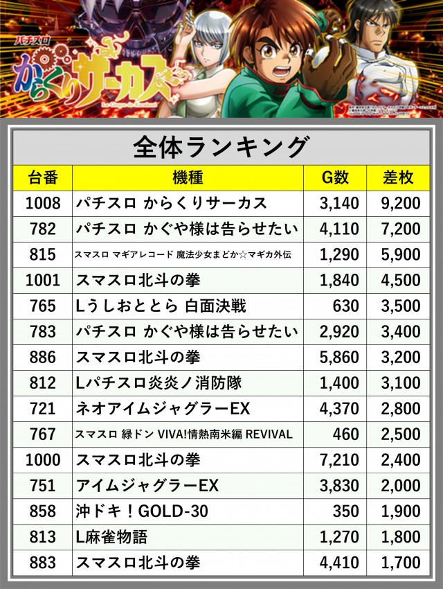 厳選された取材対象機種をはじめ、その他スロット全体から好記録が飛び出した!プレイヤーが楽しんだ1日を下記データにて振り返ってみて欲しい。