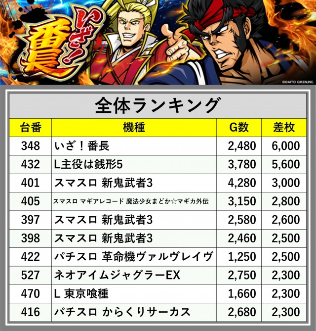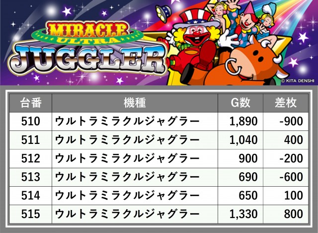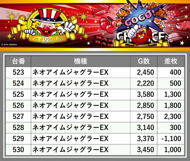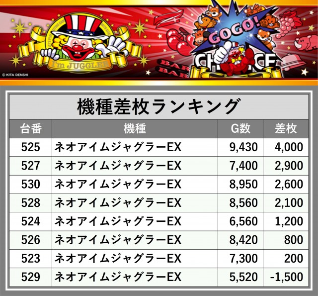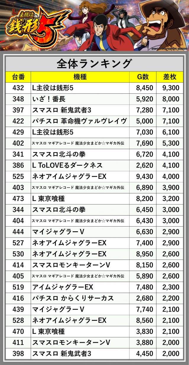 厳選された取材対象機種をはじめ、その他スロット全体から好記録が飛び出した!プレイヤーが楽しんだ1日を下記データにて振り返ってみて欲しい。