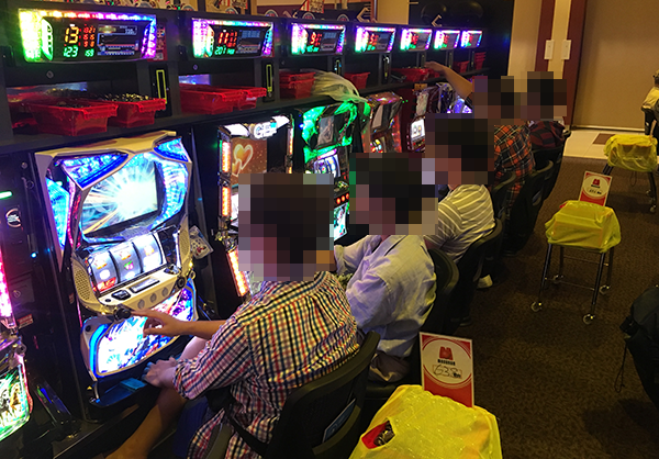 大勢のプレイヤーが活躍をみせる5円パチスロのにぎわいも大きく、明るい雰囲気がパチスロコーナー全体を包みこんでいた。