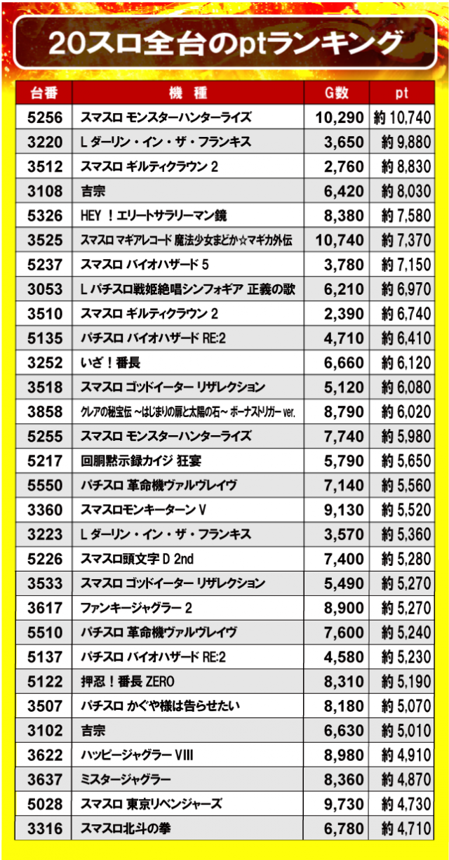 ①20スロ全台のptランキング