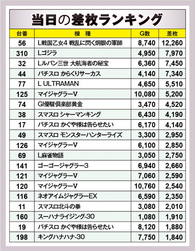 万枚達成を果たした『L戦国乙女4 戦乱に閃く炯眼の軍師』、さらに『Lゴジラ』や『Lルパン三世 大航海者の秘宝』、『パチスロ からくりサーカス』も7,000枚台と気を吐いており、店内は大きな熱気に包まれていた。また『マイジャグラーⅤ』では万回転OVERを達成した台も確認でき、もちろんAT機群も同等の活気を披露しては、閉店まで賑やかな状況だったのが見て取れる。安心して打ち込める環境が整っていた証拠で、ファンは満足度の高い1日を過ごせたに違いない。