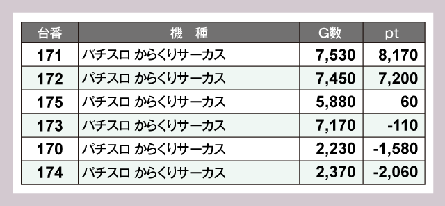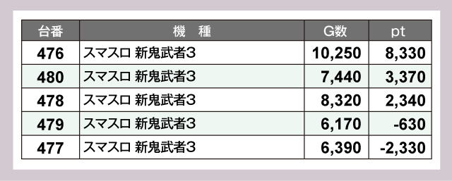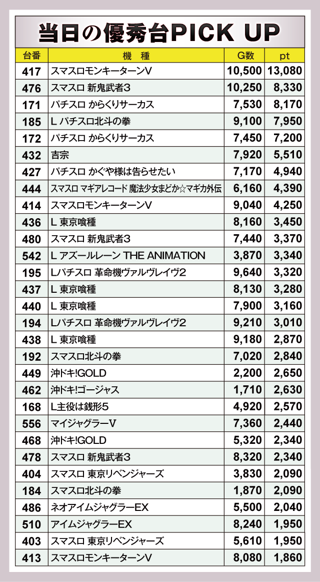 『スマスロモンキーターンV』417番台が+13,080ptと輝かしい成績をのこし、『スマスロ 新鬼武者3』476番台が+8,330pt、『パチスロ からくりサーカス』171番台が+8,170ptでそれにつづいた。そして『L パチスロ北斗の拳』185番台が+7,950pt、『パチスロ からくりサーカス』172番台が+7,200ptで並ぶ。以下にも『吉宗』432番台の+5,510ptなど、超優秀台がいくつも誕生した豪華なデータとなっていた。