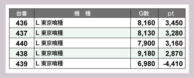 『L 東京喰種』は全台が高稼働。5台中4台が4桁プラスと、ptの面でも文句なしの結果となった。