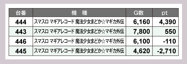 『パチスロ からくりサーカス』と『スマスロ マギアレコード 魔法少女まどか☆マギカ外伝』は半数の台がプラスptで、どちらもトータルで大きくプラスと実力を発揮していたようだ。