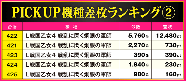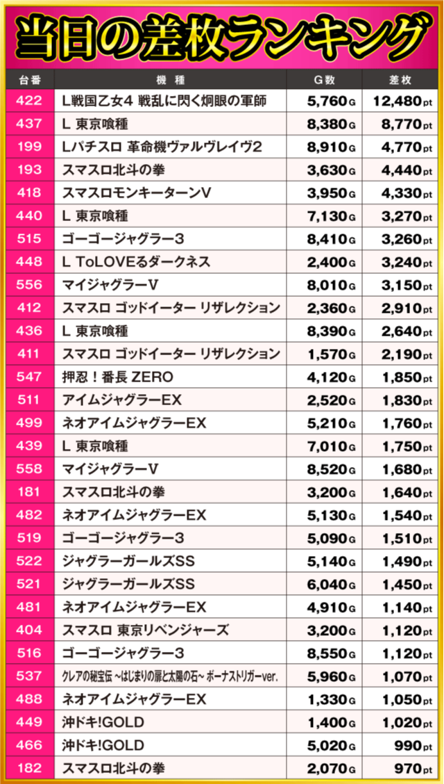 この日は、『L戦国乙女4 戦乱に閃く炯眼の軍師』が圧巻の+12,480ptを叩き出しランキングトップに。次いで『L 東京喰種』が+8,770pt、さらには導入直後の新台『Lパチスロ 革命機ヴァルヴレイヴ2』が+4,770ptを記録するなど、新旧を問わず様々な機種からハイスコアが飛び出している。