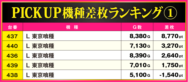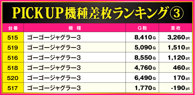 今回のPICK UP機種は全3機種で、差枚上位にランクインした『L戦国乙女4 戦乱に閃く炯眼の軍師』と『L 東京喰種』以外に『ゴーゴージャグラー3』からも多数の好調台を確認。最終的に3機種トータルの全16台中14台がプラス差枚となっているだけに、それぞれのシマは常に活気に包まれる一日となった。