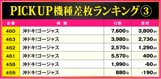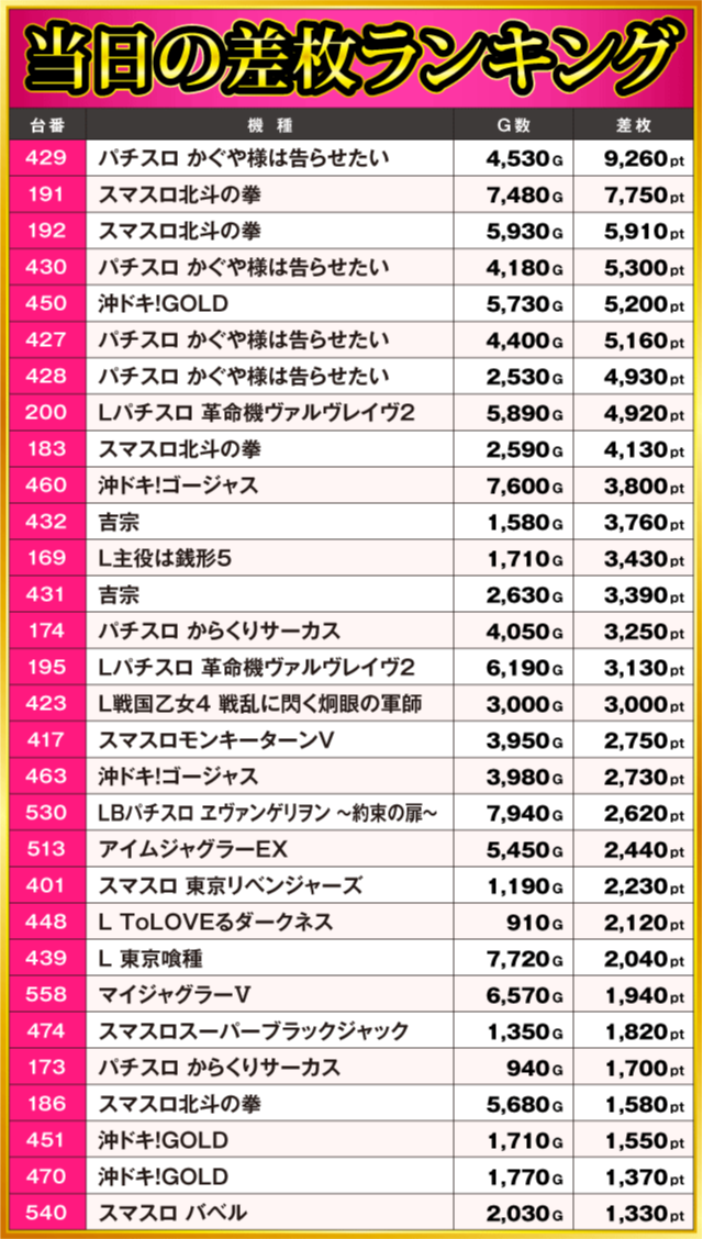当日の差枚ランキング