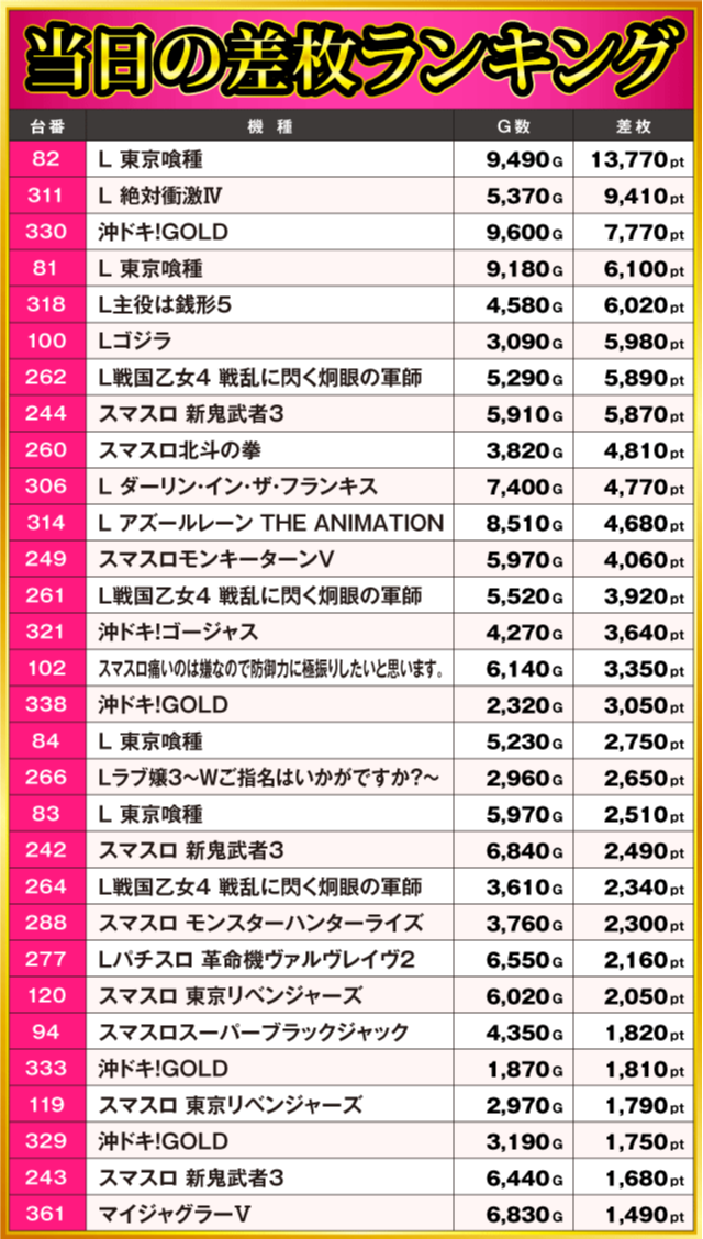 この日、店内で最も目立っていたのが『L 東京喰種』で、82番台が圧巻の+13,770ptを叩き出し堂々のランキングトップに輝いている。次いで『L 絶対衝激Ⅳ』が+9,410pt、『沖ドキ!GOLD』が+7,770ptを記録するなど、人気機種を中心にハイスコアが続出し店内を盛り上げていた。