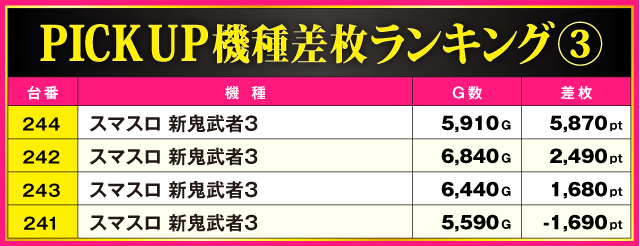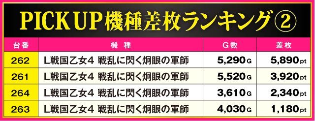 続いてPICK UP機種の状況を見ていくと、ランキングを制した『L 東京喰種』は万枚超以外にも+6,100ptを確認。また、『L戦国乙女4 戦乱に閃く炯眼の軍師』と『スマスロ 新鬼武者3』はともに+5,000pt超が発生している。さらに、3機種合わせた全12台中11台がプラス差枚となる見事な結果を残しているだけに、ファンにとって充実の一日となったのは間違いないだろう。