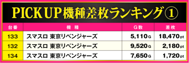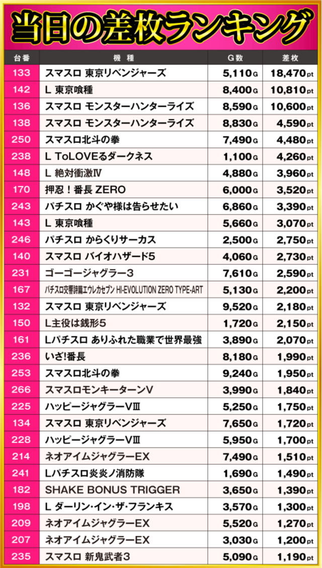 店内で最もプレイヤーの注目を集めていたのが『スマスロ 東京リベンジャーズ』で、133番台が怒涛の+18,470ptを叩き出し堂々のランキングトップに。さらに、『L 東京喰種』と『スマスロ モンスターハンターライズ』も万枚超を達成しており、差枚ベスト3が実にハイレベルな結果を残す一日となった。