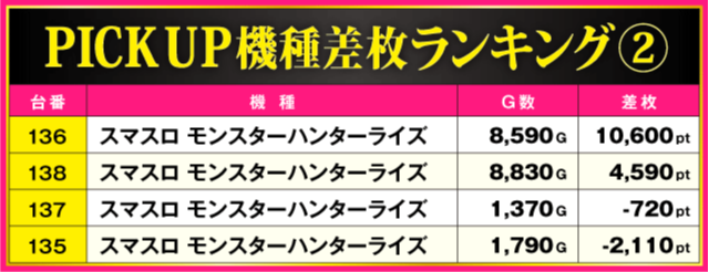 今回のPICK UP機種は差枚上位にランクインした3機種で、ハイスコアを記録した台以外からも多数の好調台を確認。最終的に3機種トータルの全10台中7台がプラス差枚となる見事な結果を残しているだけに、ファンにとって充実の一日となったのは間違いないだろう。