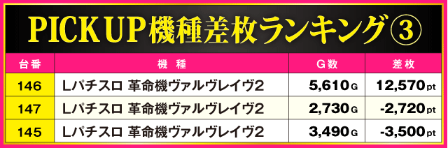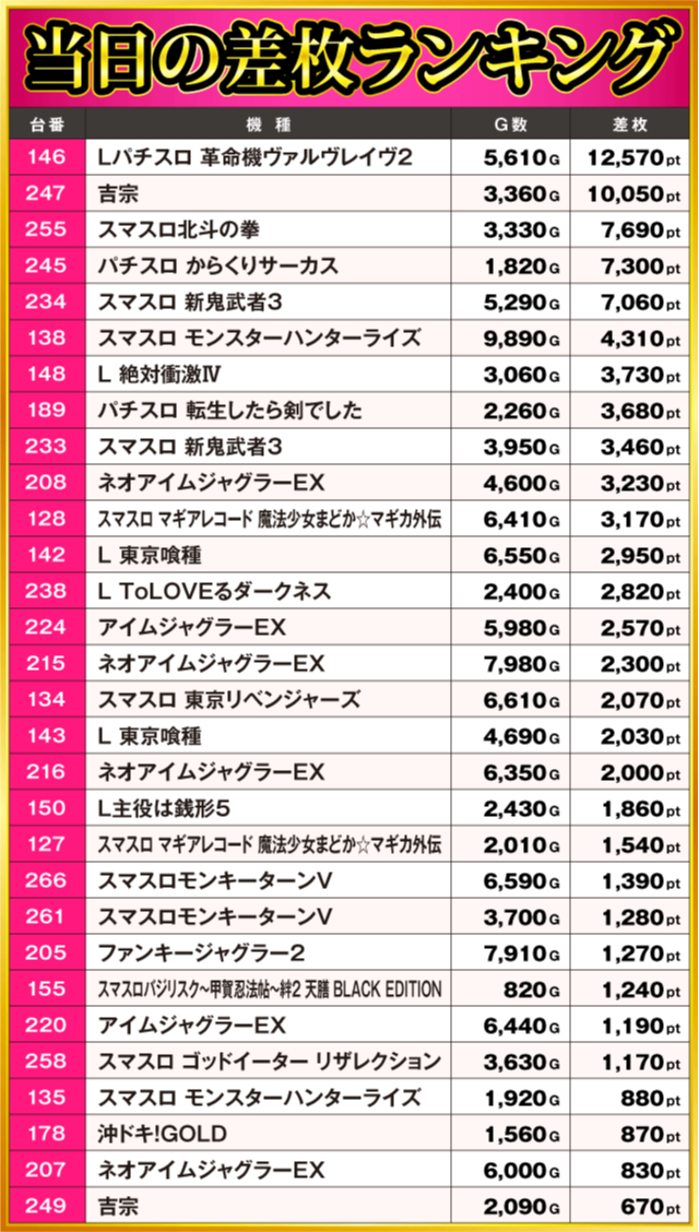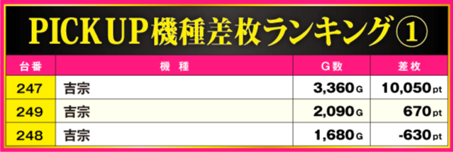 今回のPICK UP機種は差枚上位にランクインした3機種。好成績が飛び出しただけでなく、その他の台からも複数の好調台が確認されており、それぞれのシマは常に活気に満ち溢れていた。3機種のファンにとって充実の一日となったのは間違いないだろう。