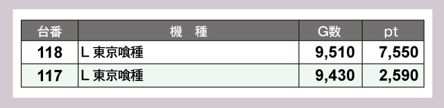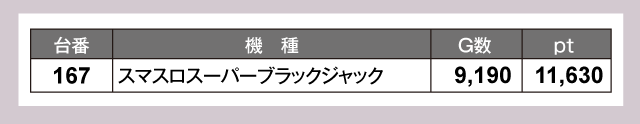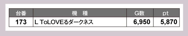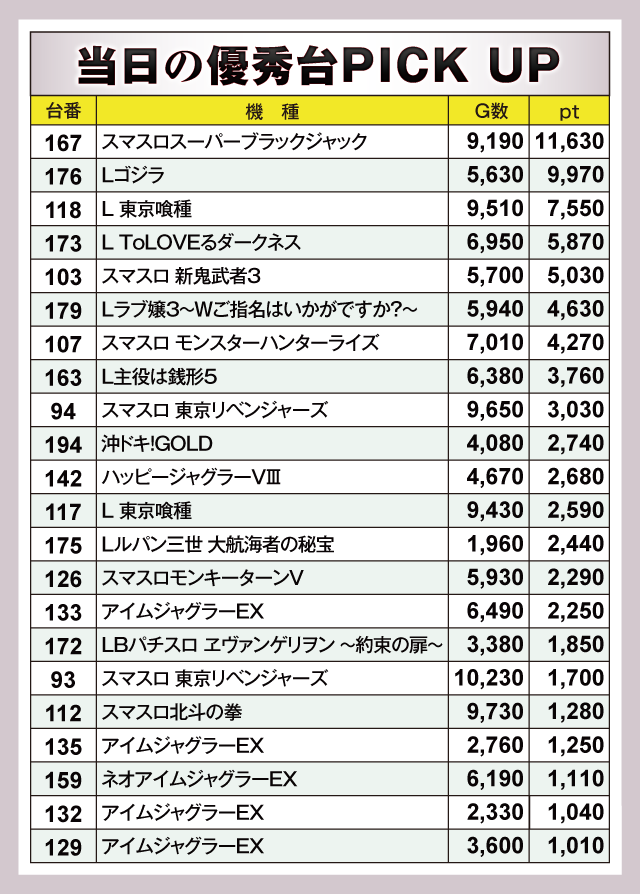 『スマスロスーパーブラックジャック』167番台が+11,630ptと1万ptオーバーの大活躍。そして『Lゴジラ』176番台が+9,970ptでつづいていた。さらに『L 東京喰種』118番台が+7,550pt、『L ToLOVEるダークネス』173番台が+5,870pt、『スマスロ 新鬼武者3』103番台が+5,030ptと超優秀台が並ぶ。以下にも『Lラブ嬢3〜Wご指名はいかがですか?〜』179番台の+4,630ptなどなど、店内の熱気を証明するような見事なデータとなっていた。