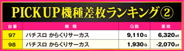 この日、最もプレイヤーの注目を集めたのが『パチスロ からくりサーカス』で、97番台が+6,320ptを記録しランキングトップに。次いで『スマスロ北斗の拳』から+4,370pt、『いざ!番長』と『Lラブ嬢3〜Wご指名はいかがですか?〜』、『沖ドキ!GOLD』から+2,000pt超が発生し店内を盛り上げていた。