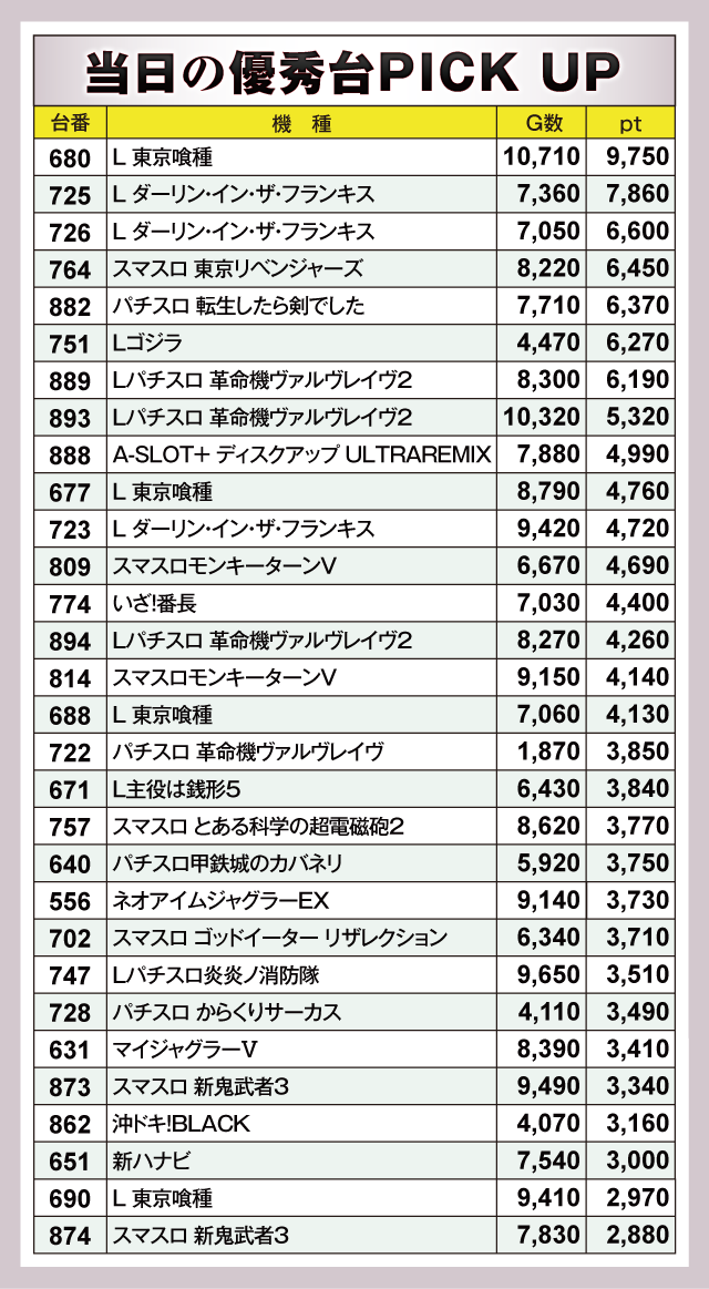 『L 東京喰種』680番台が+9,750ptと、圧倒的な成績で頭ひとつ抜けだしていた。そして『L ダーリン・イン・ザ・フランキス』725番台が+7,860pt、726番台が+6,600ptでつづく。さらに『スマスロ 東京リベンジャーズ』764番台の+6,450pt、『パチスロ 転生したら剣でした』882番台の+6,370ptとかなりの優秀台がひしめき合い、見事なデータを示してくれていた。