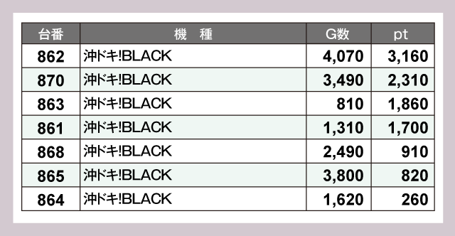 定番機種の『マイジャグラーⅤ』は高稼働の台が多く、G数に比例するかのように好結果をのこしていた。『沖ドキ!BLACK』は稼働にバラつきがあり、実力を発揮しきれなかった台も見受けられる。
