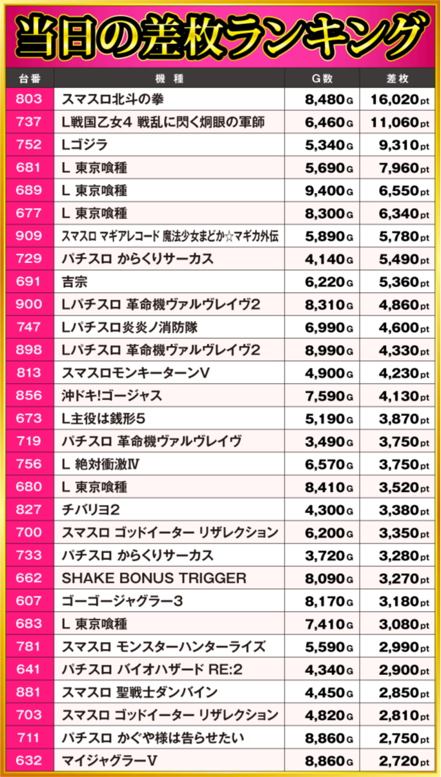 この日、最もプレイヤーの注目を集めたのが『スマスロ北斗の拳』で、803番台が怒涛の+16,020ptを記録。続く『L戦国乙女4 戦乱に閃く炯眼の軍師』も万枚超を達成している。さらに、『Lゴジラ』から+9,310pt、『L 東京喰種』は+7,960ptに+6,000pt超が2台も発生しており、差枚上位機種が実にハイレベルな結果を残し店内を盛り上げていた。