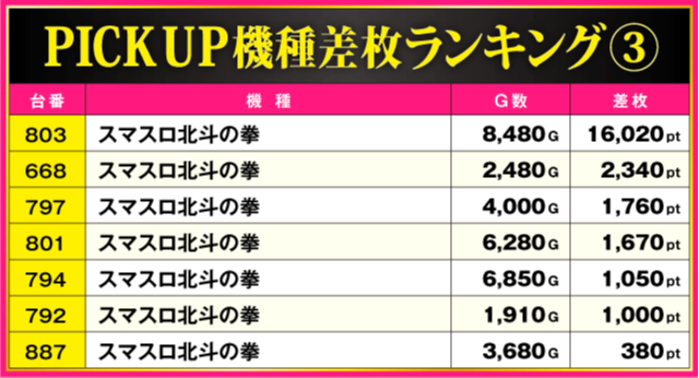 今回のPICK UP機種は全3機種。ハイスコアを記録した『スマスロ北斗の拳』と『L 東京喰種』以外に『スマスロ モンスターハンターライズ』からも多数の好調台が確認されており、最終的に全6台中4台がプラス差枚で実戦を終えている。それぞれの機種のファンにとって充実の一日となったのは間違いないだろう。