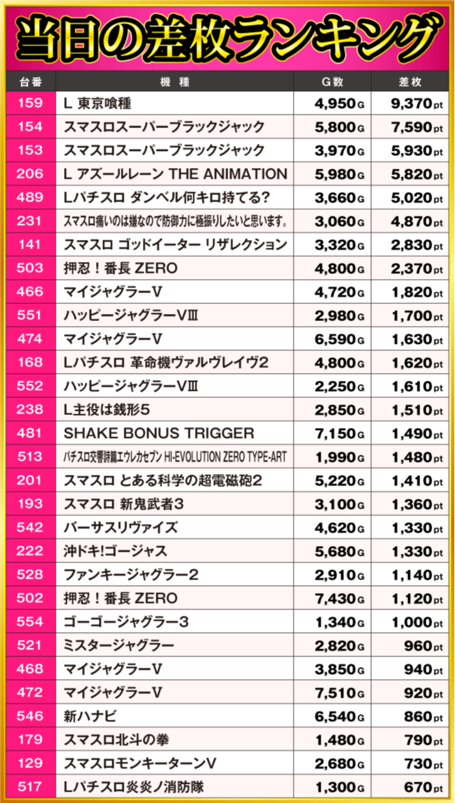 この日は、『L 東京喰種』が万枚目前の+9,370ptを叩き出しランキングトップに輝いた。次いで『スマスロスーパーブラックジャック』が+7,590pt、+5,930ptといったハイスコアを連発。さらに、『L アズールレーン THE ANIMATION』と『Lパチスロ ダンベル何キロ持てる?』が+5,000pt超を記録する盛況ぶりを見せている。