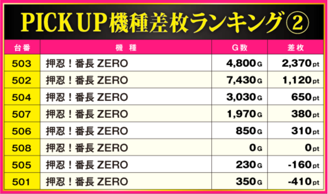 今回のPICK UP機種は全3機種で、差枚上位にランクインした『スマスロスーパーブラックジャック』以外にも多数の好調台を確認。『押忍!番長ZERO』は全8台中5台、『ハッピージャグラーVⅢ』は全2台中2台がプラス差枚で実戦を終える見事な結果を残しているだけに、それぞれのシマは終日ファンの笑顔と活気に包まれていた。