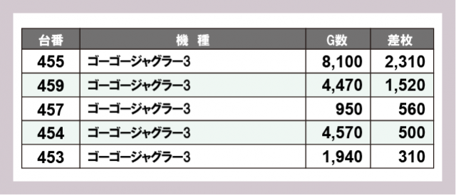 ※差枚数順に掲載しています