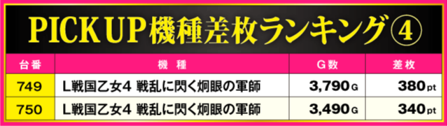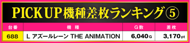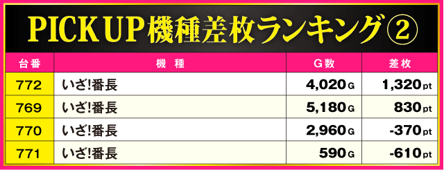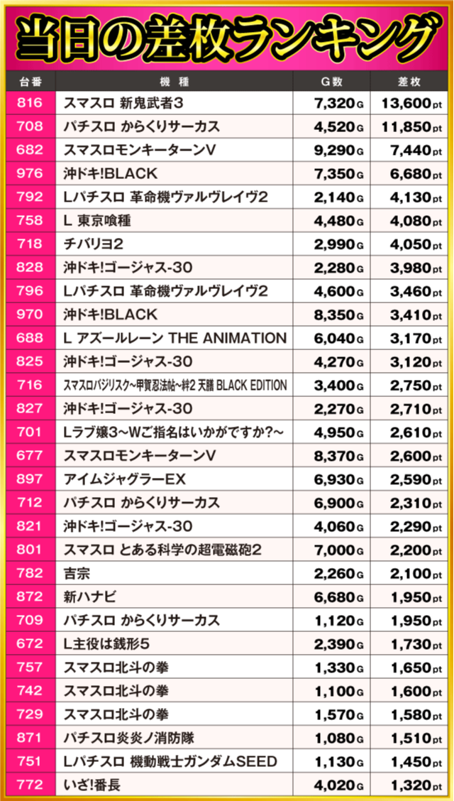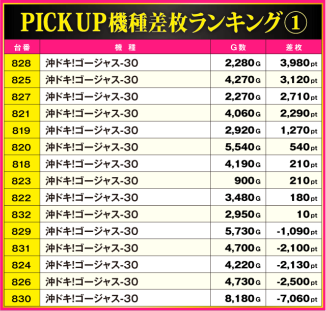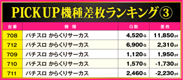 次にPICK UP機種の状況をチェックしていくと、好成績が飛び出した『パチスロ からくりサーカス』以外にも多数の好調台を確認。特に『沖ドキ!ゴージャス-30』は全15台中10台、『いざ!番長』は半数の台がプラス差枚となる見事な結果を残しているだけに、3機種のファンにとっては大満足の一日となったはずだ。